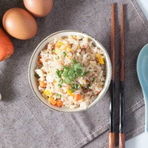 Stir-fried cooked rice in a wok with vegetables, soya sauce, and scrambled eggs.