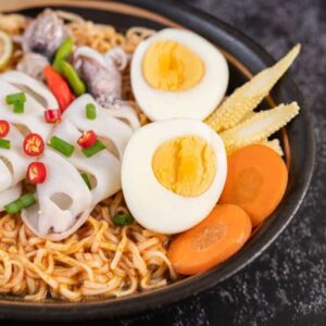 Scrambled eggs and noodles stir-fried with sauces and vegetables.